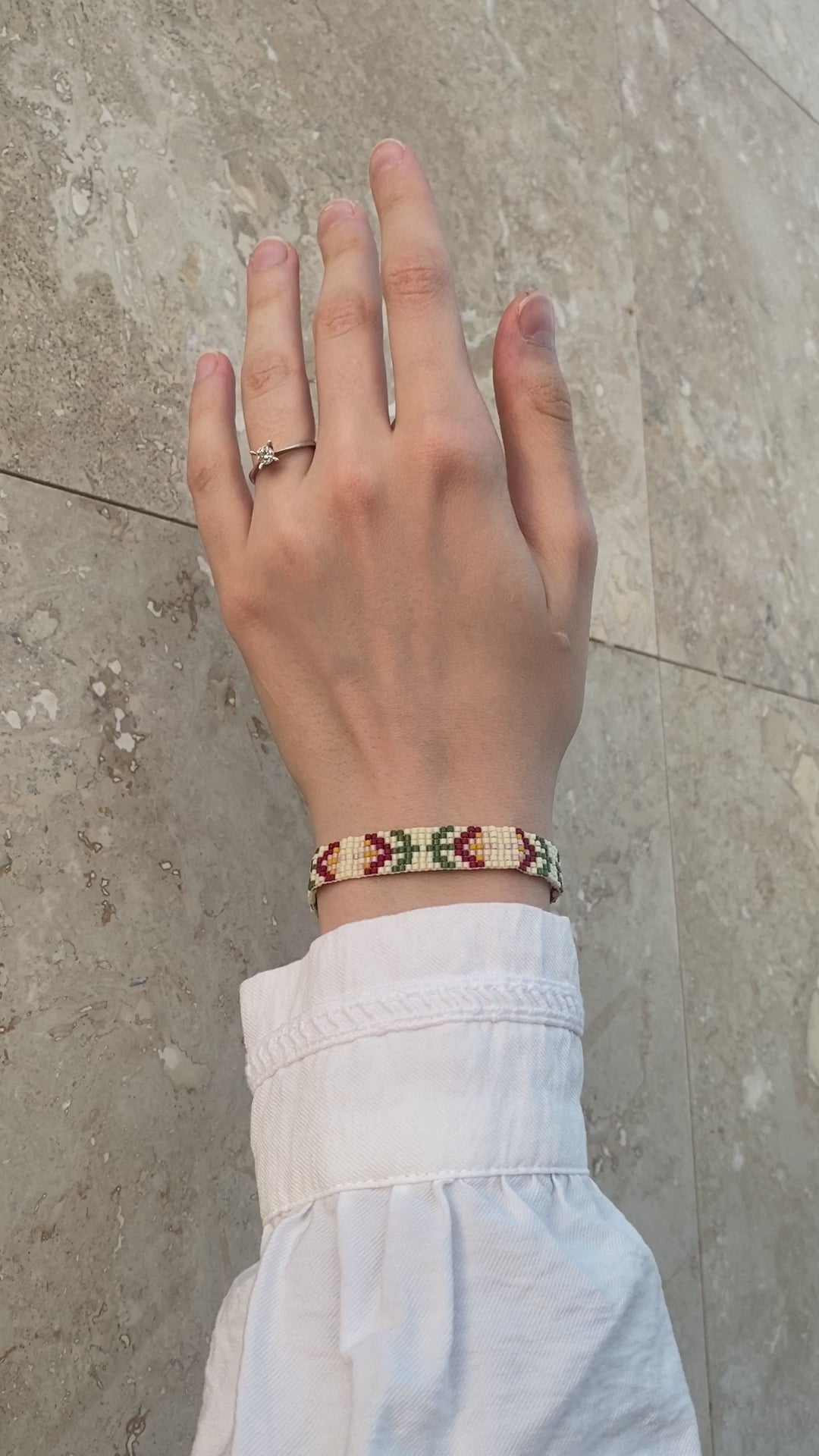 Bu el yapımı Miyuki bileklik, yumuşak pastel tonlarda büyüleyici bir çiçek desenine sahiptir. Zarif işçiliği ve vintage esintili tasarımıyla her görünüme incelikli ve romantik bir dokunuş katar. Hafif, ayarlanabilir ve zamansız zarafeti seven bohem ruhlar için mükemmeldir.