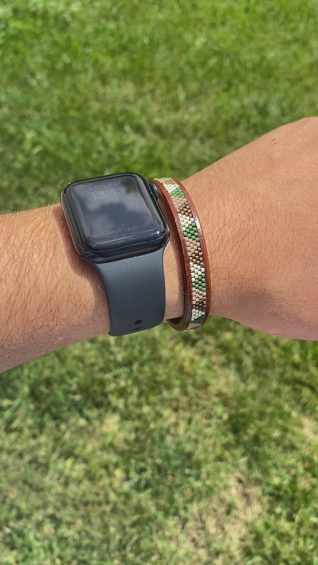 Tarzınızı doğadan ilham alan özgün bir dokunuşla tamamlayın. 🌿El işçiliğiyle hazırlanmış bu bileklik, kaliteli kahverengi deri üzerine işlenmiş orijinal Miyuki boncuklarla tasarlandı. Krem, yeşil ve toprak tonlarının uyumu bilekliğe zamansız bir şıklık katıyor.